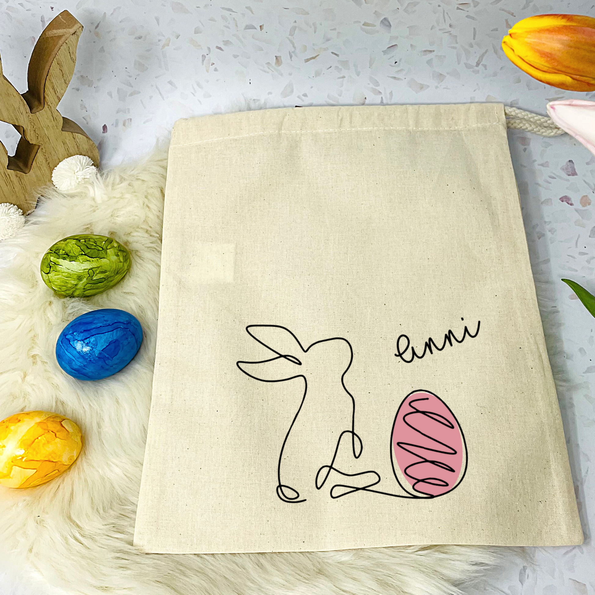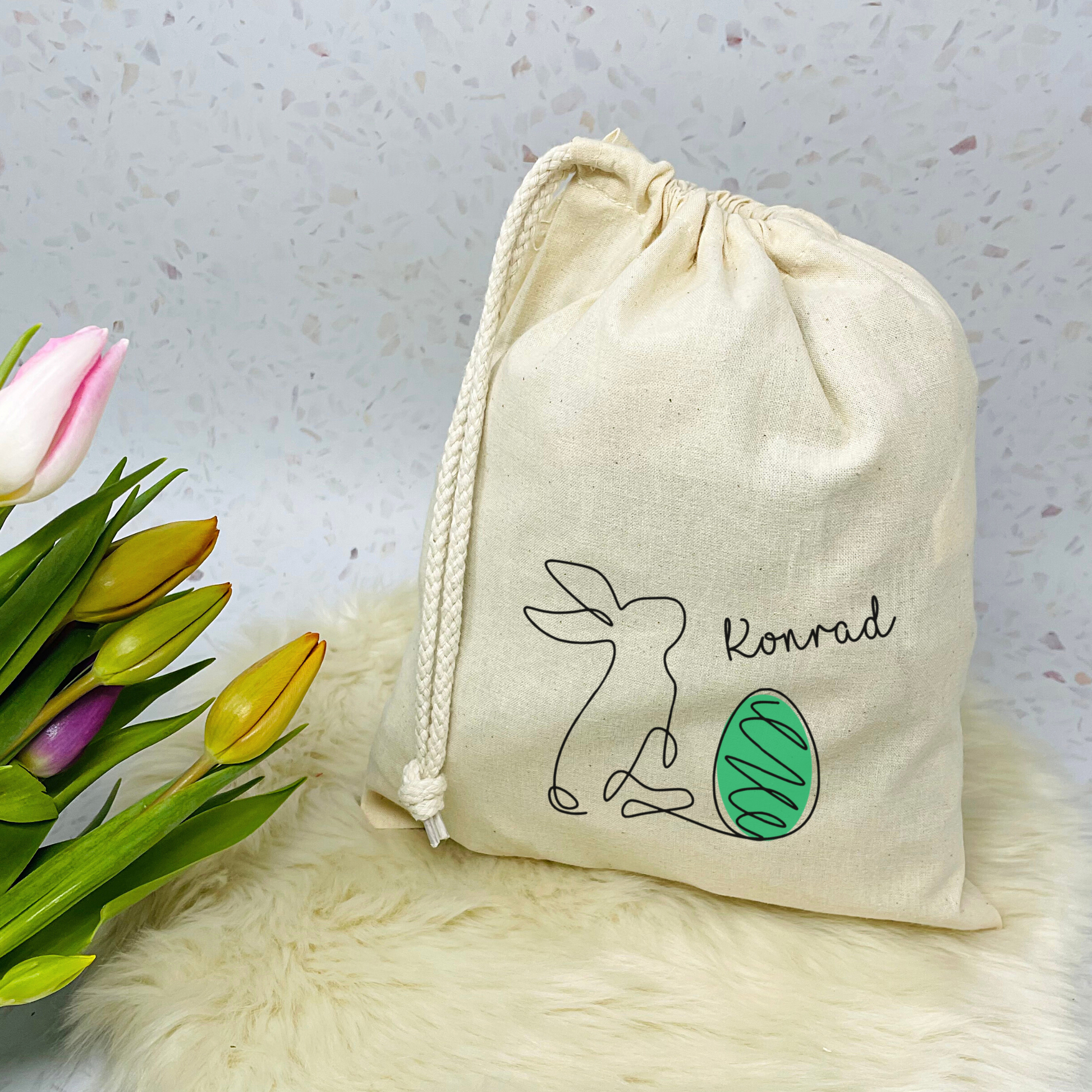 Osterbeutel aus Baumwolle, bedruckt im angesagten One Line Design mit Osterhase und Name.