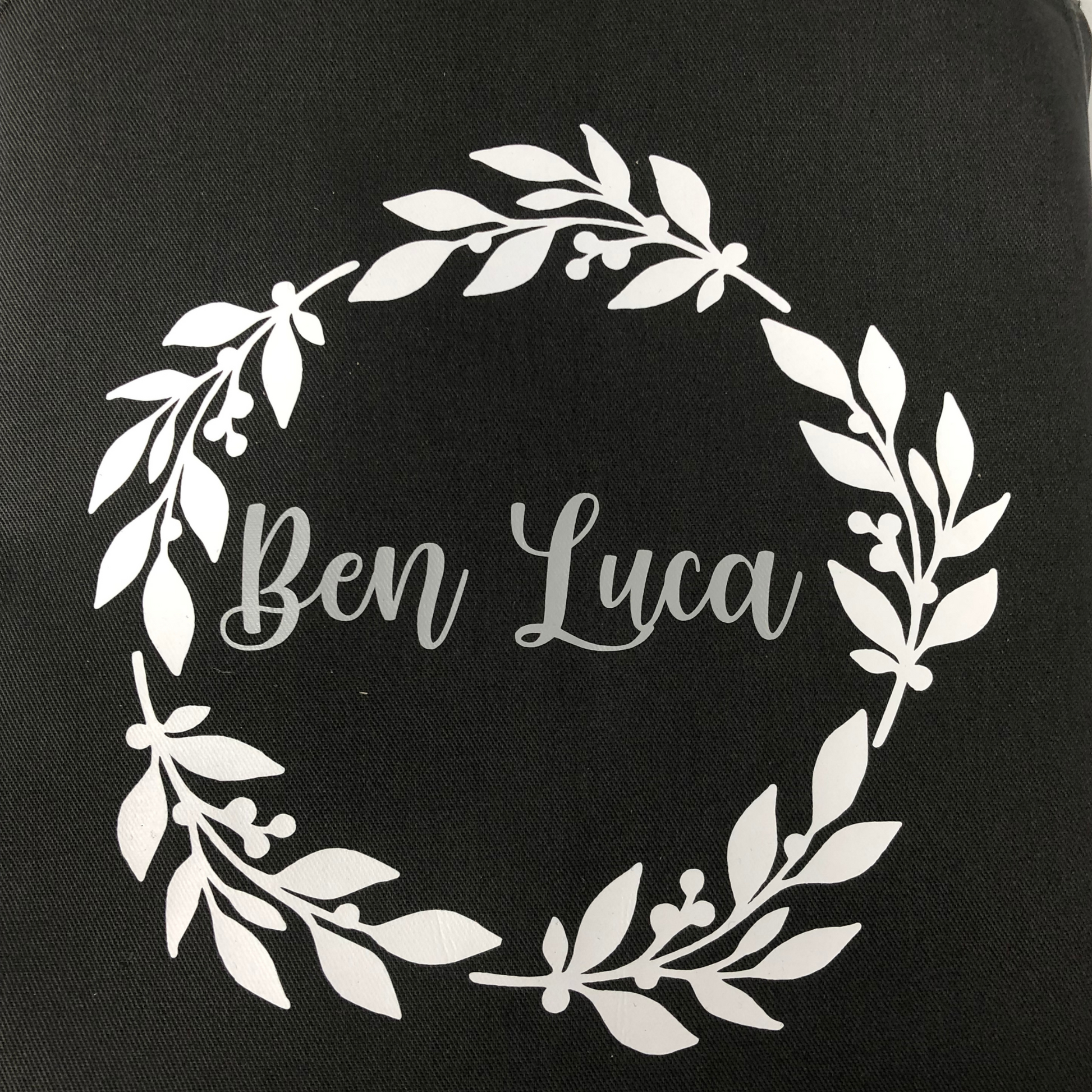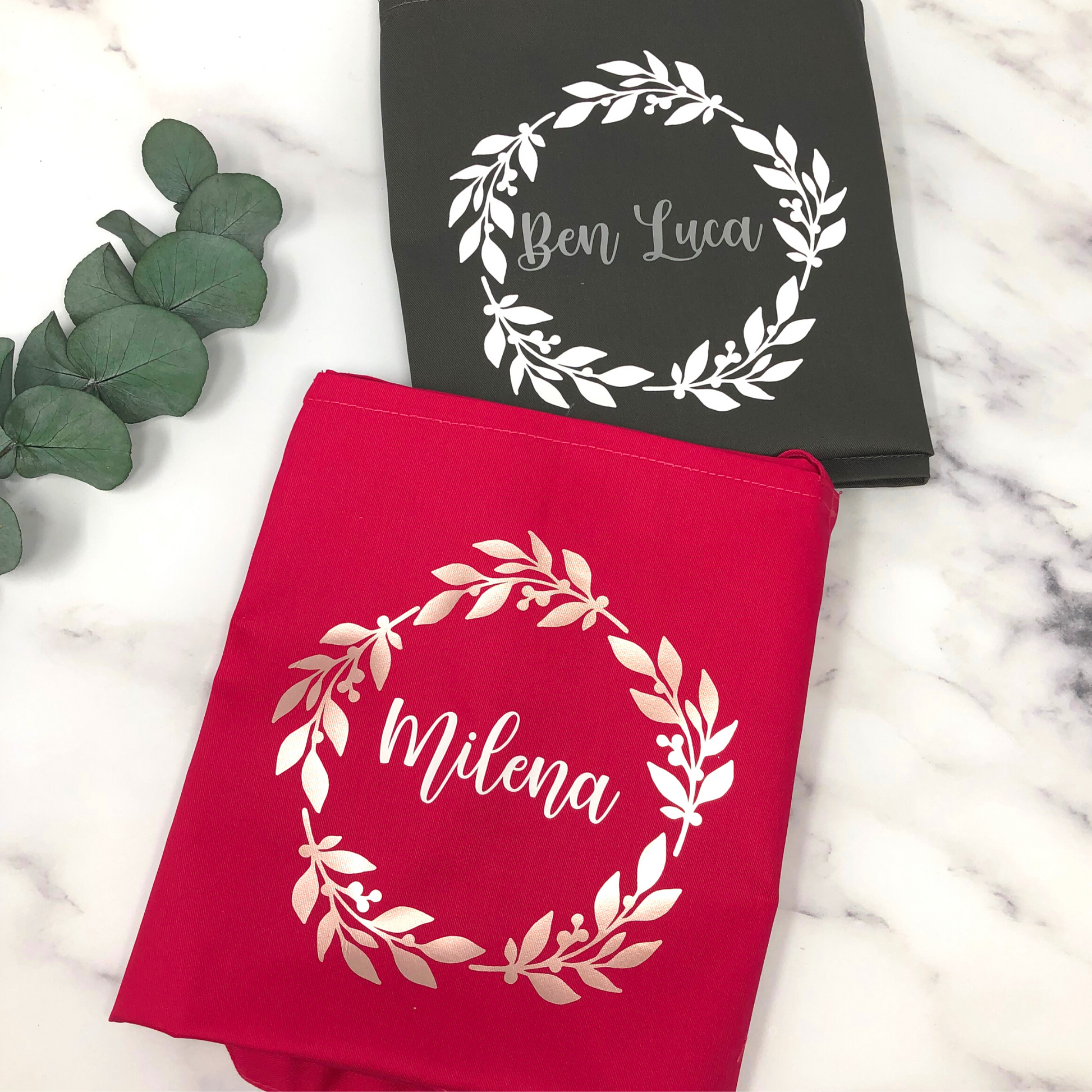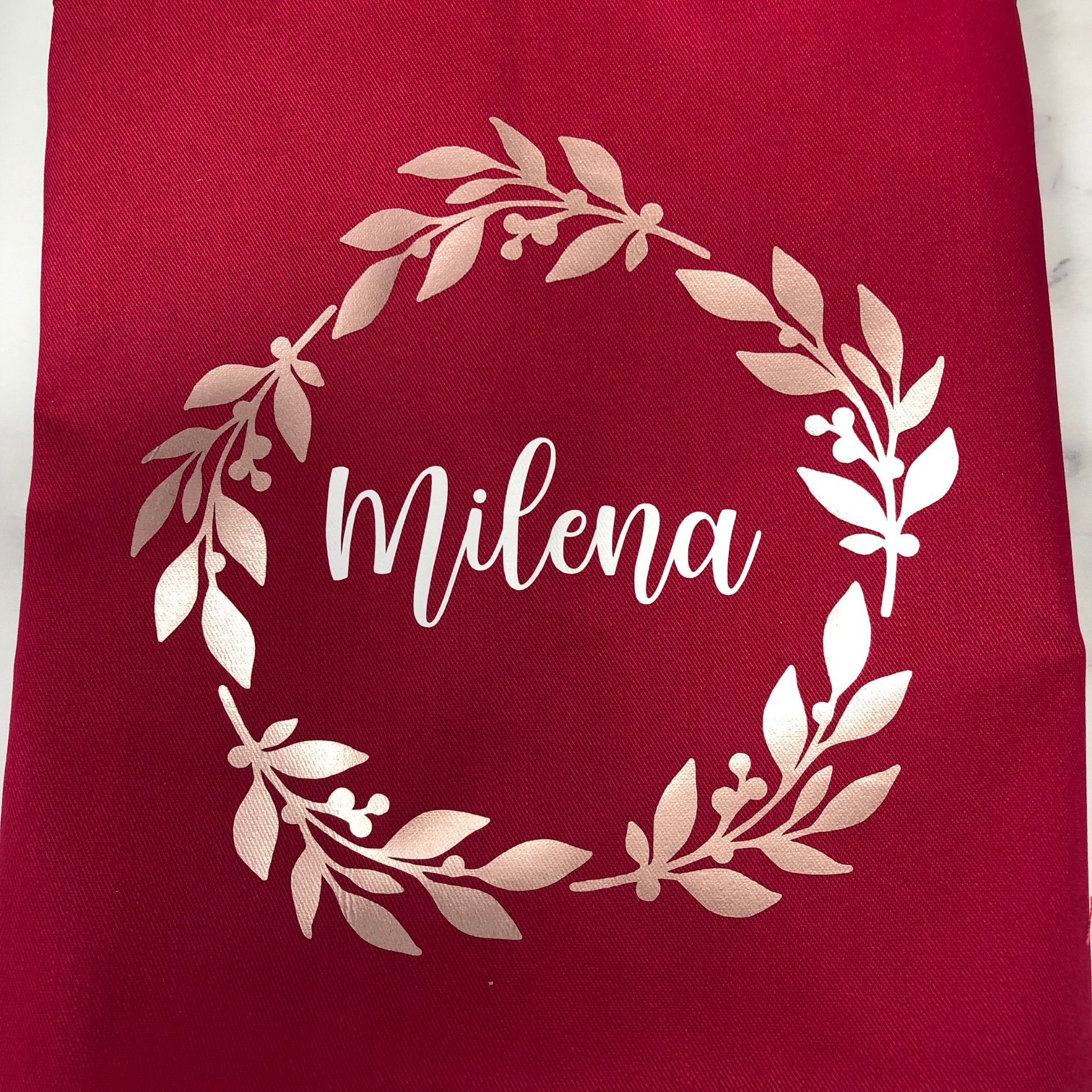 Schöne Schürze in 7 Farben mit Blätterkranz und Namen.