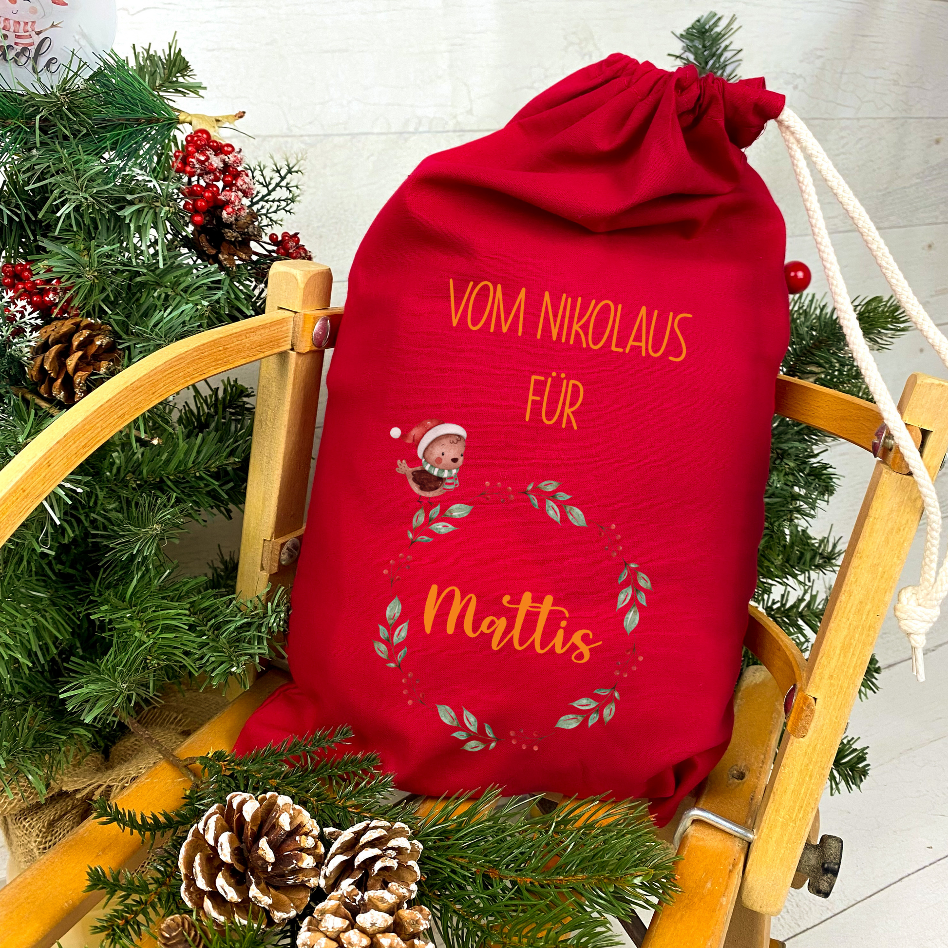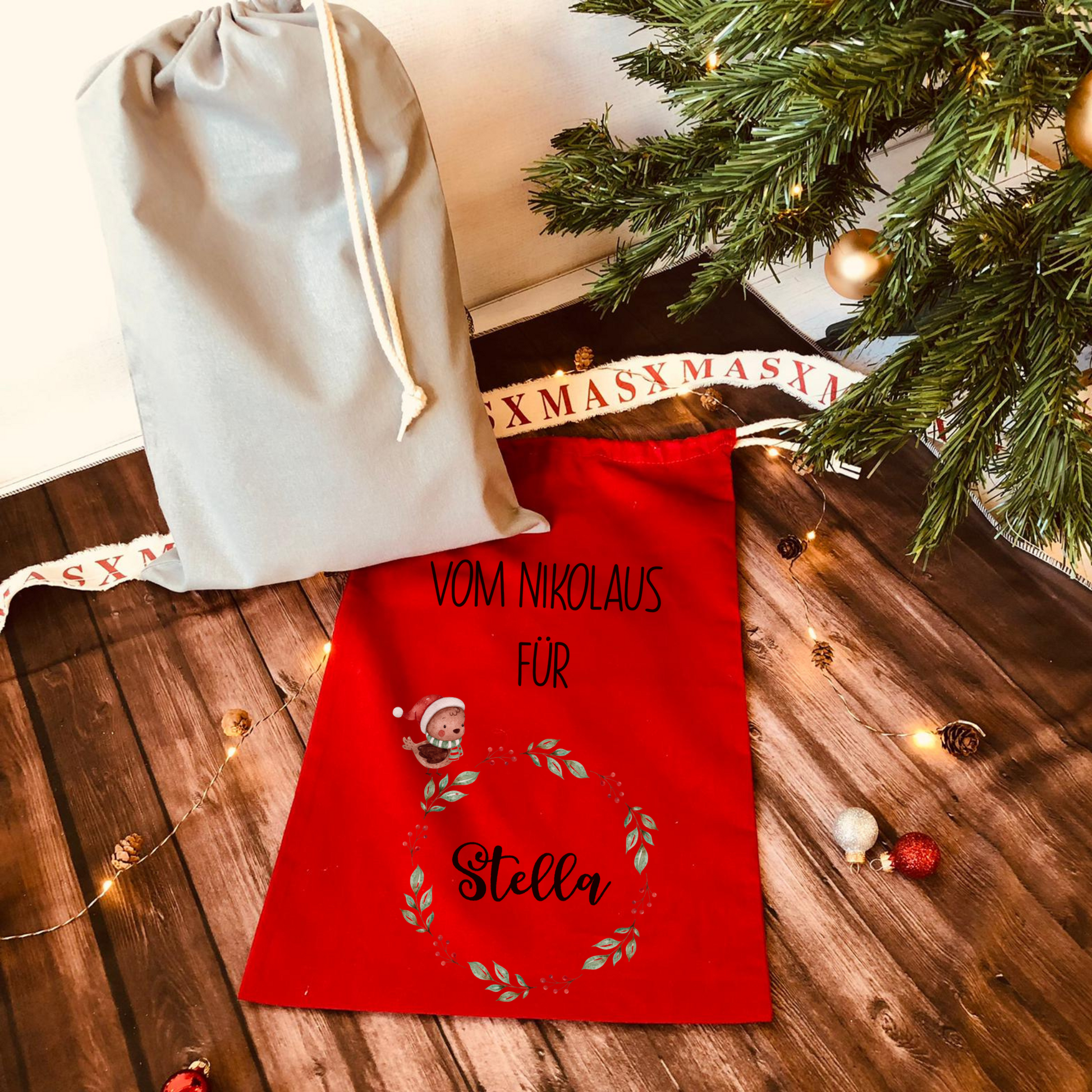 Weihnachtsbeutel aus Baumwolle in praktischer Größe, bedruckt mit unserem süßen Weihnachtsdesigns, personalisiert mit Namen in der Farbe rot.