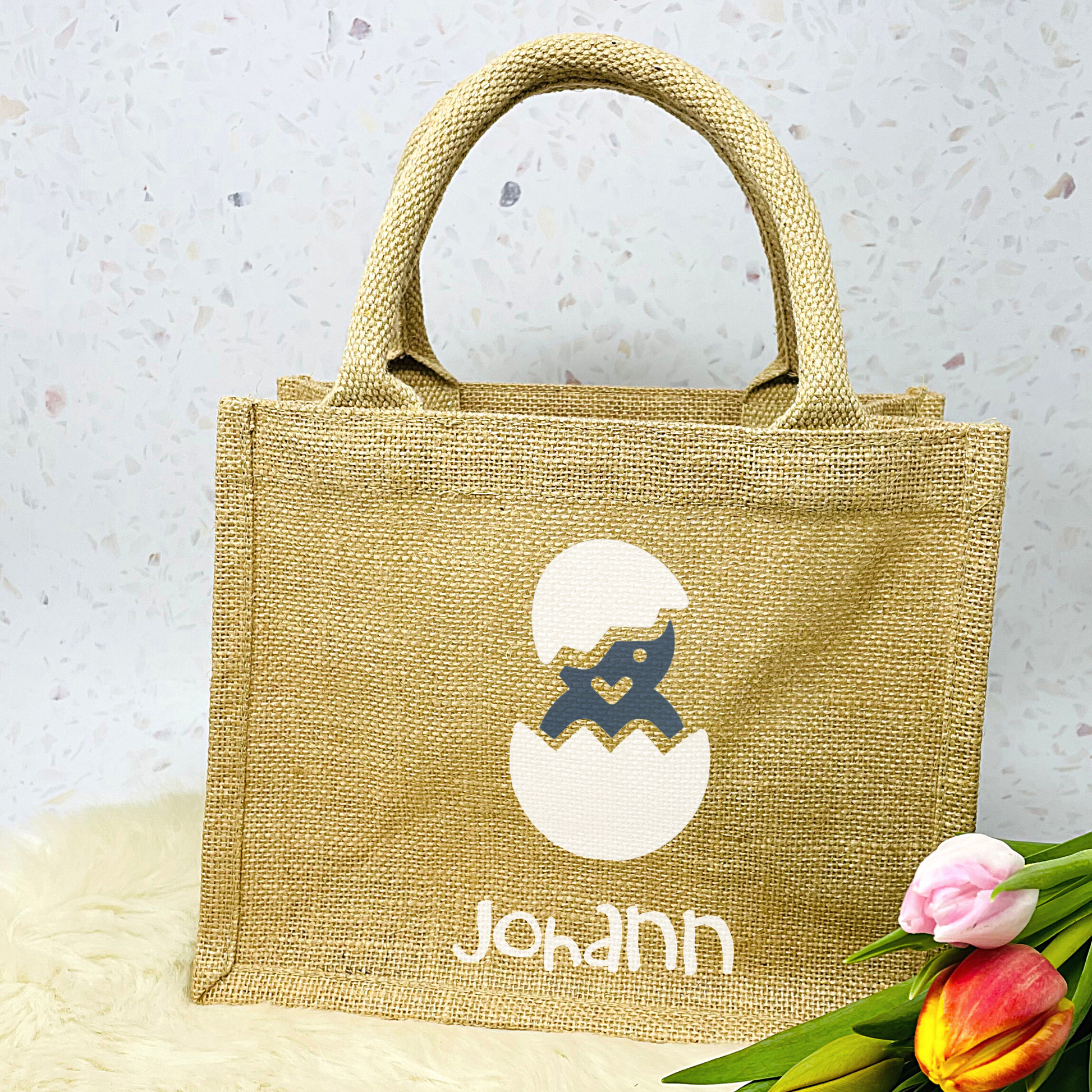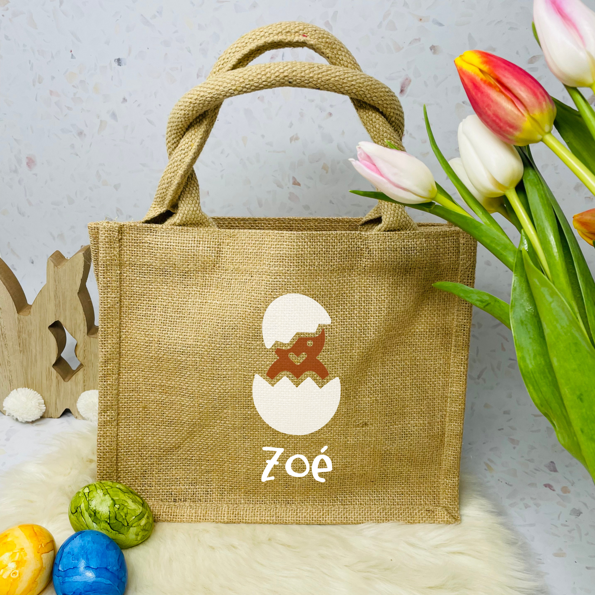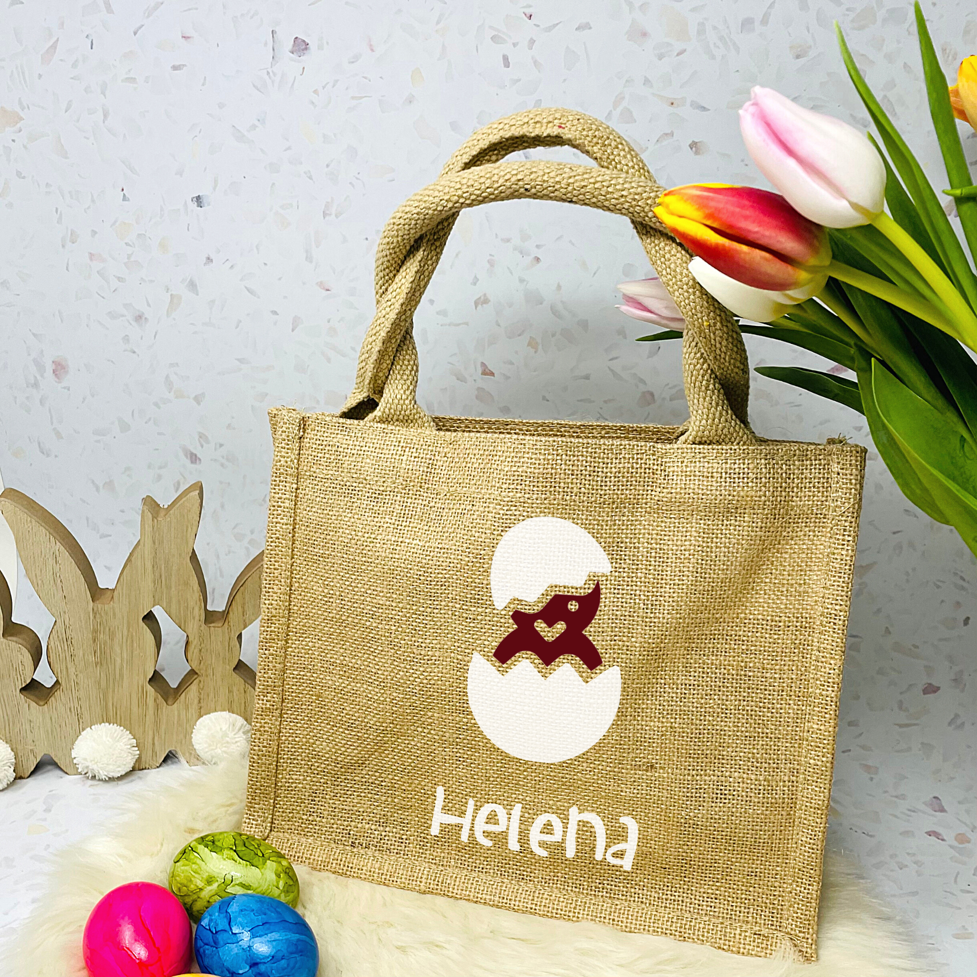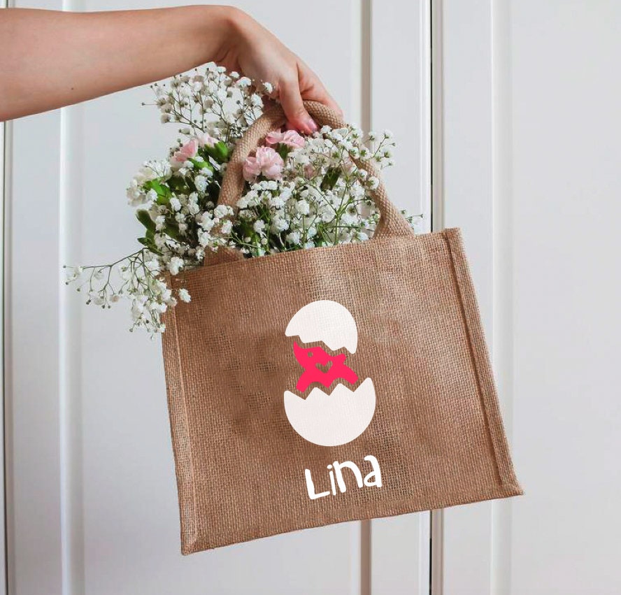 Osterbeutel aus beschichteter Jute, bedruckt mit süßem Küken in einer Farbe deiner Wahl, den Namen drucken wir in weiß in der Schriftart wie abgebildet.