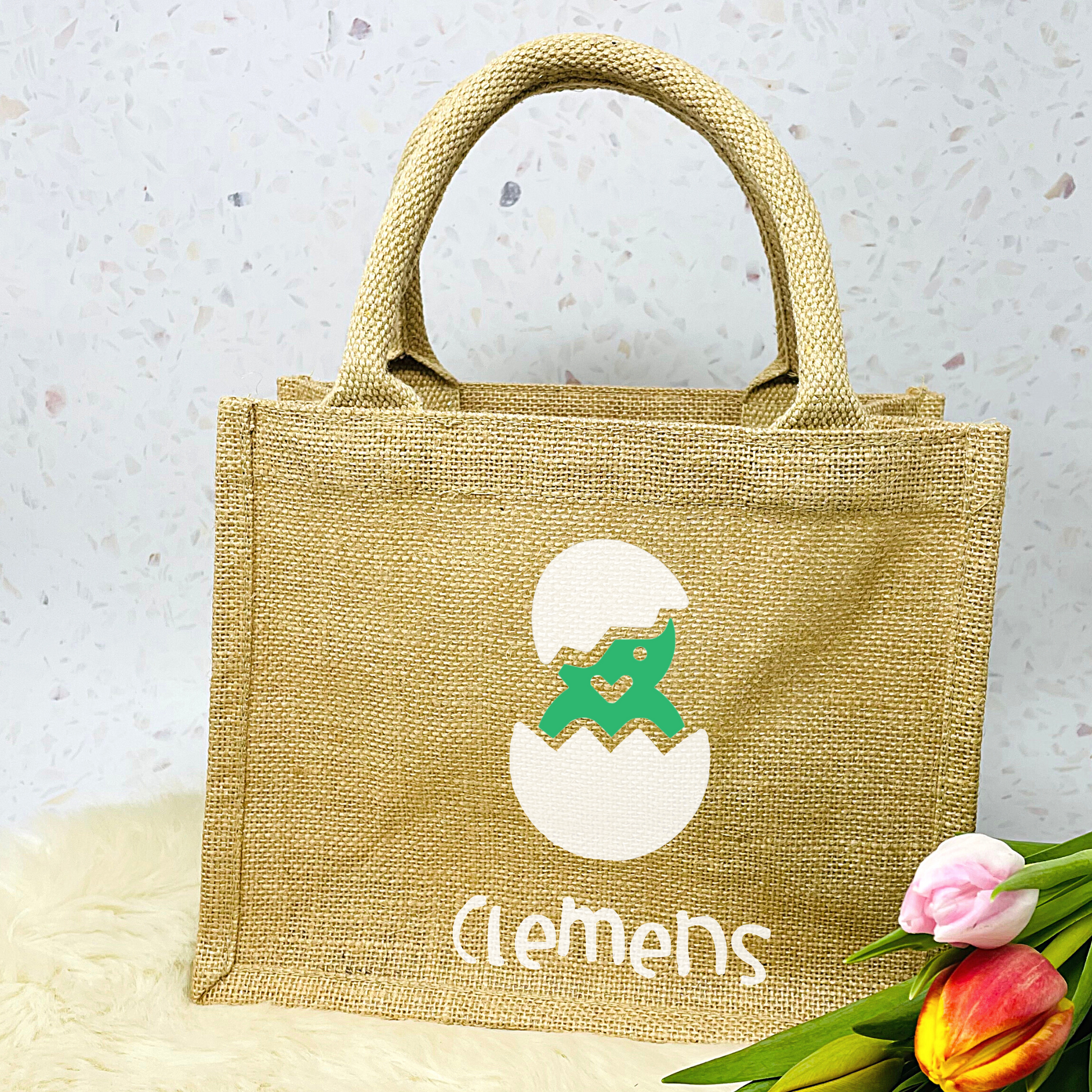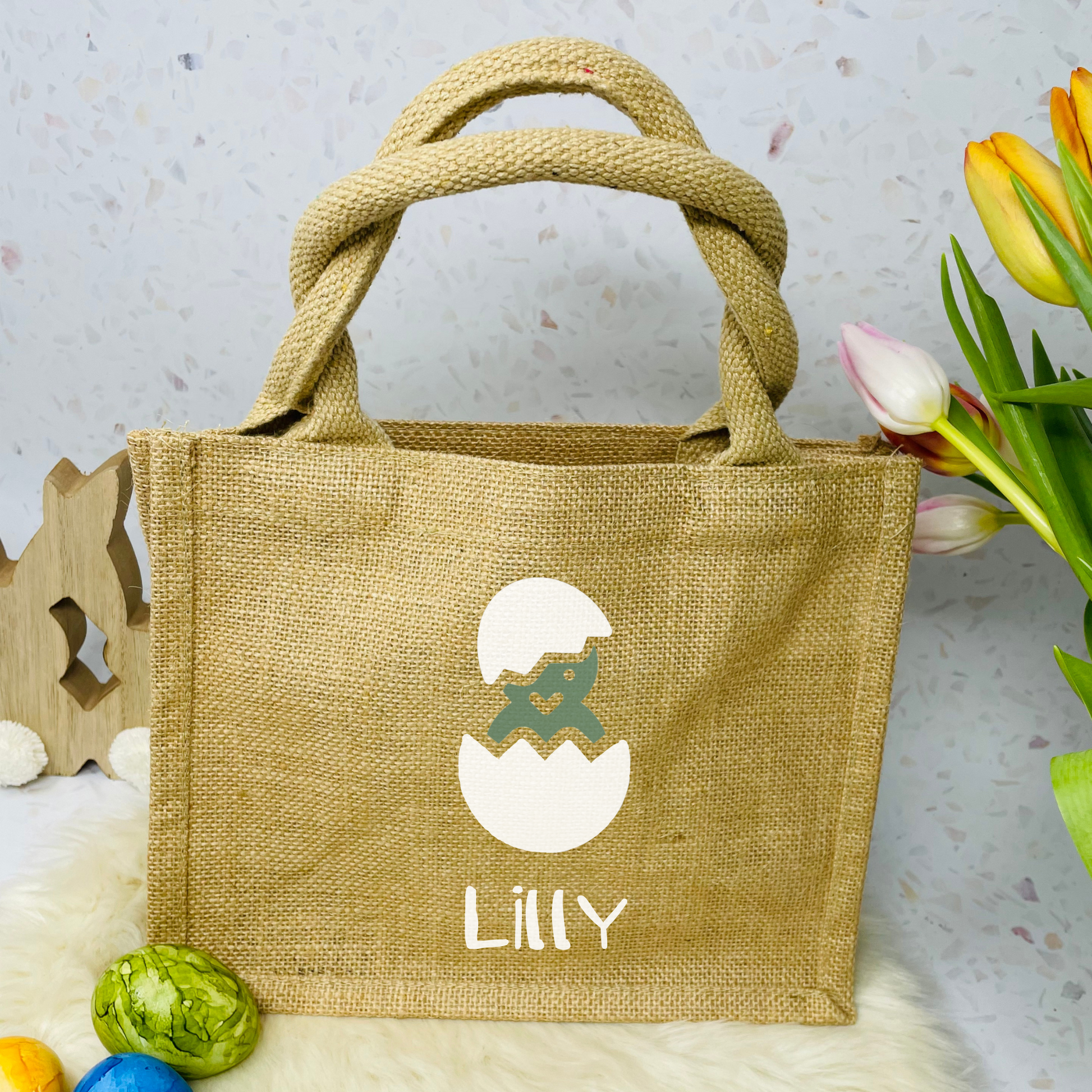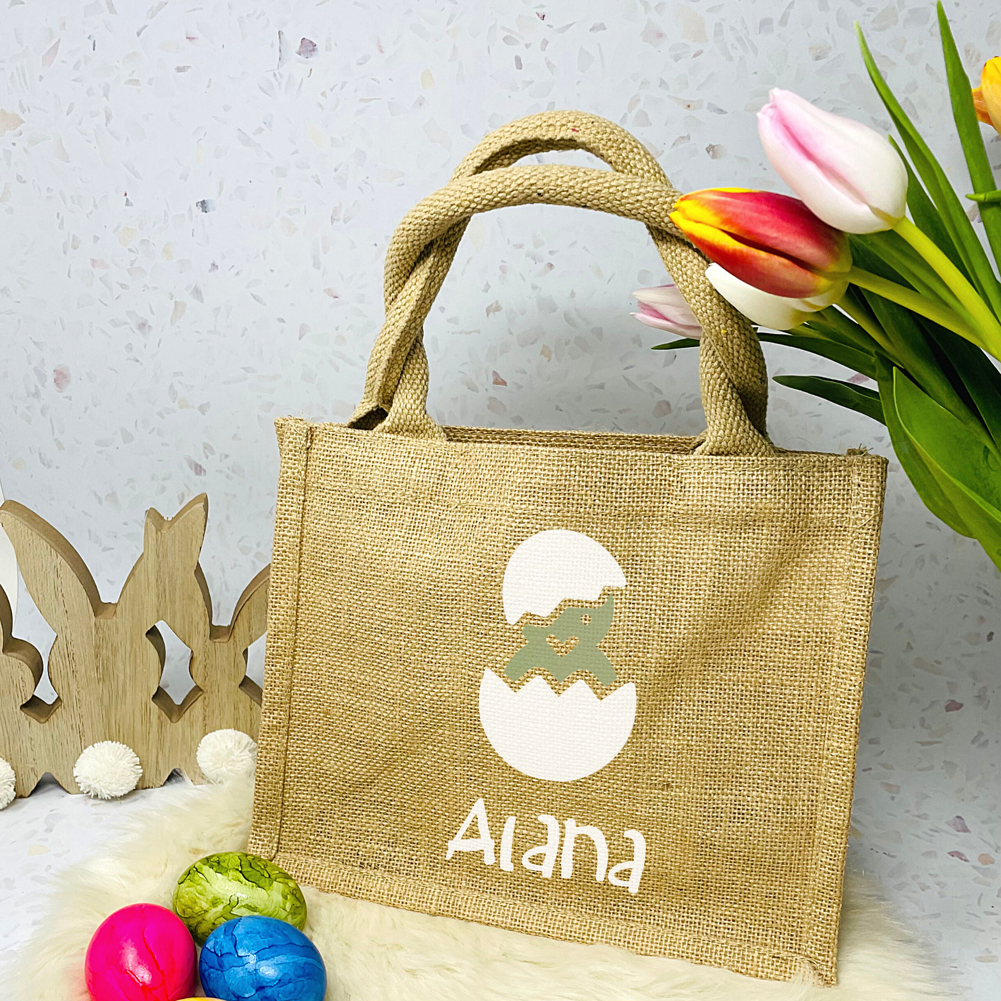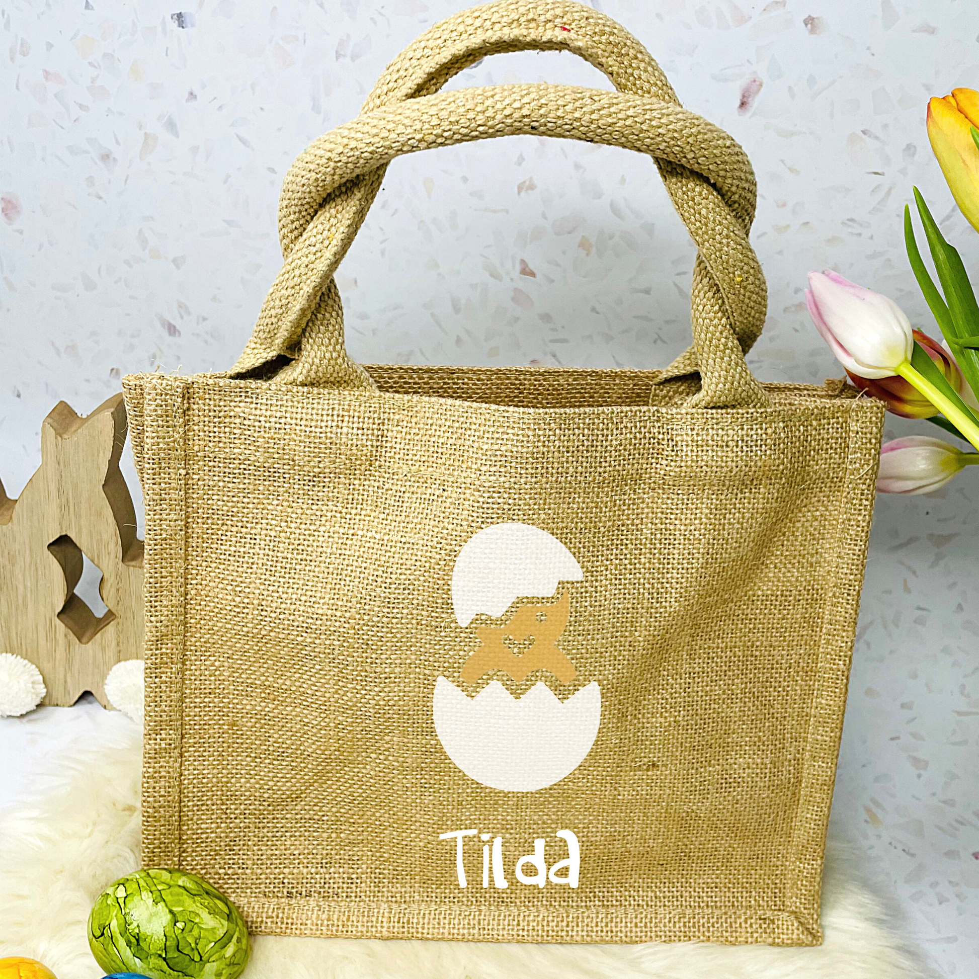 Osterbeutel aus beschichteter Jute, bedruckt mit süßem Küken in einer Farbe deiner Wahl, den Namen drucken wir in weiß in der Schriftart wie abgebildet.