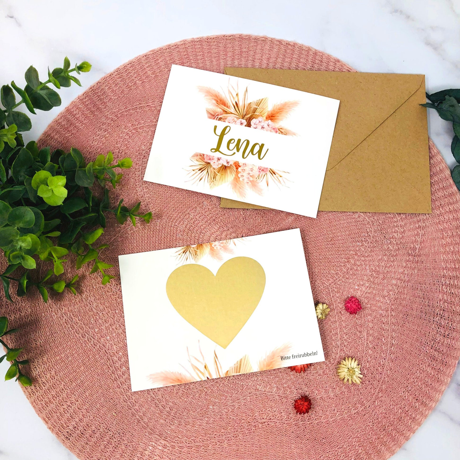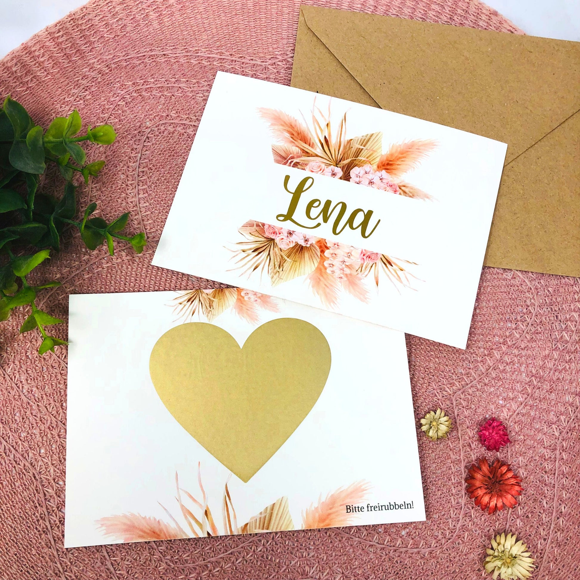 Die Vorderseite wird mit einem Namen eurer Wahl mit Folie in Gold personalisiert. Auf der Rückseite steht, versteckt hinter einem goldenem Rubbelherz: