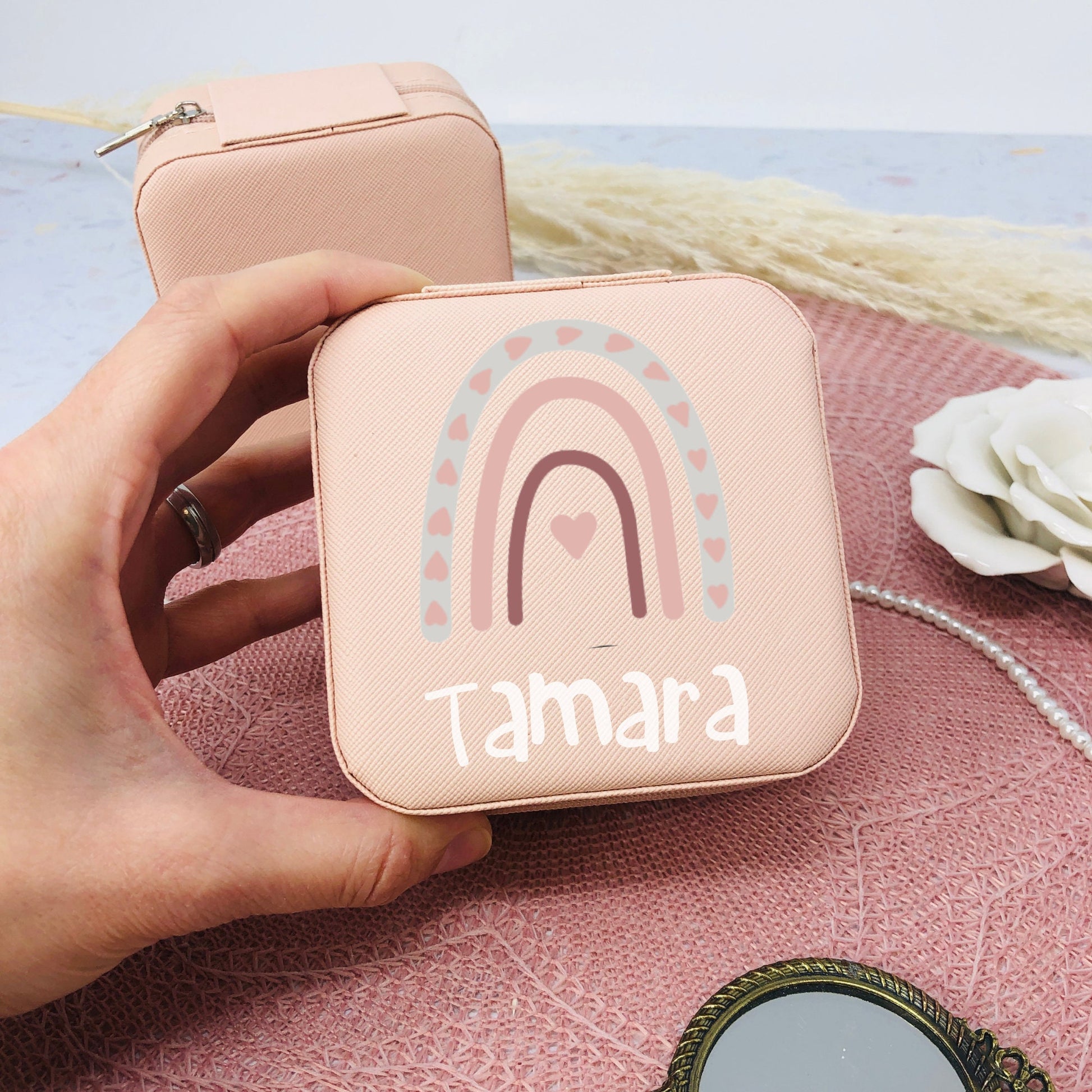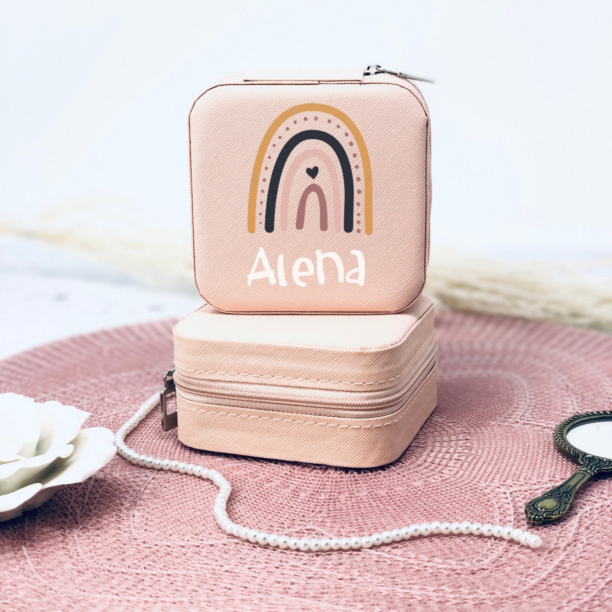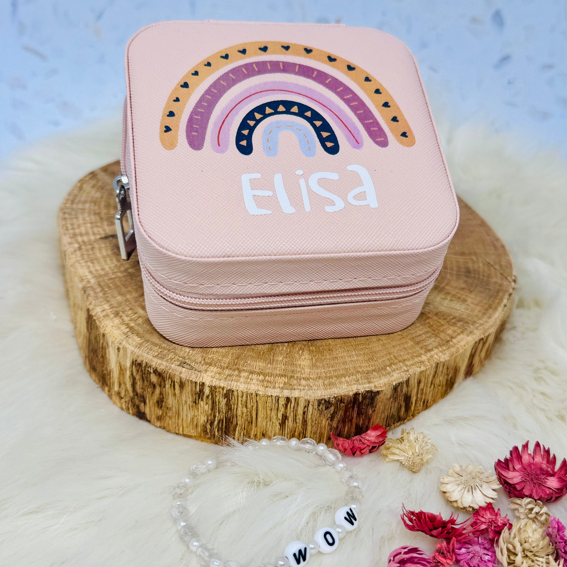 Schmuckaufbewahrung Mädchen - rosa - personalisiert mit Namen und Regenbogen- Geschenk Kommunion Einschulung Geburtstag - Reiseetui