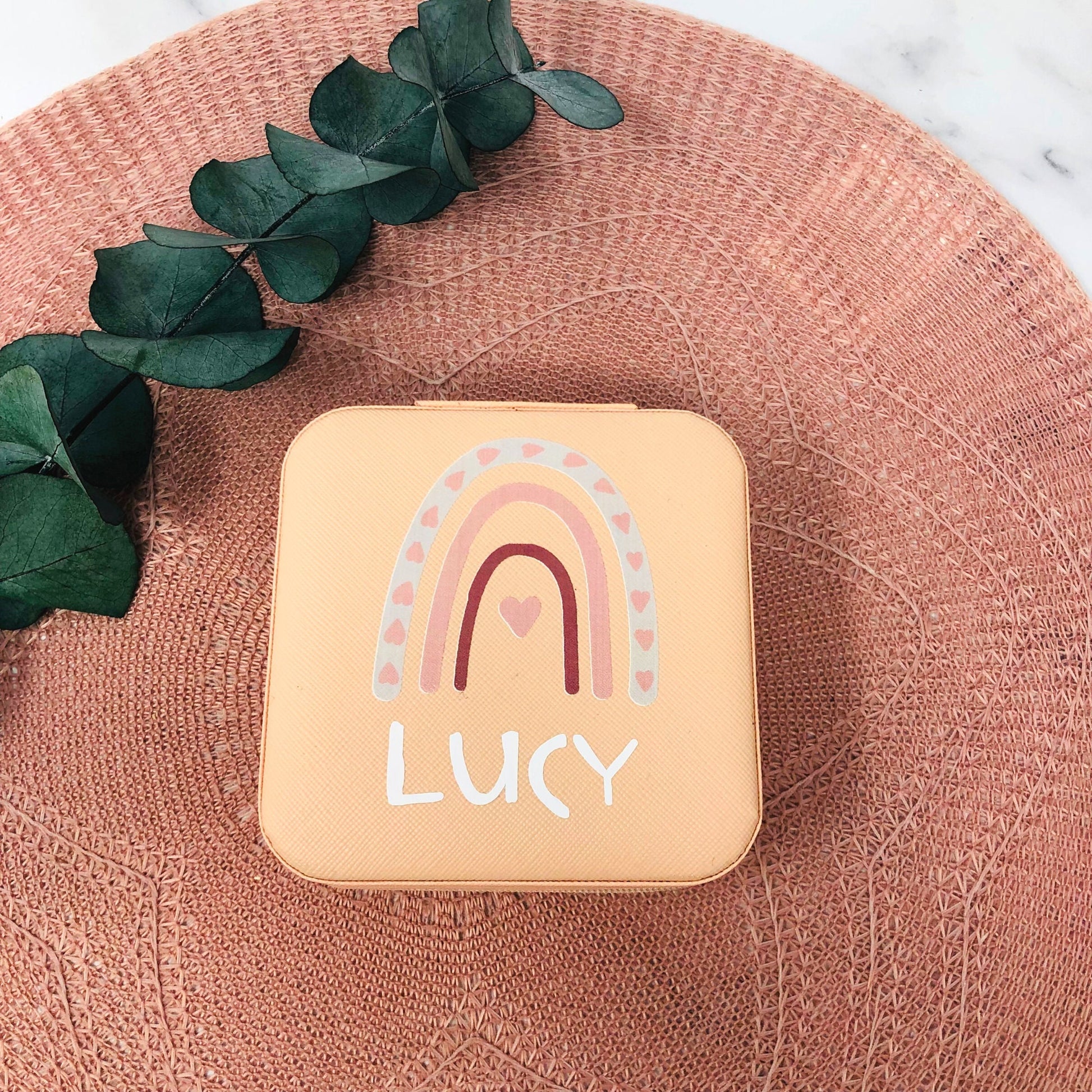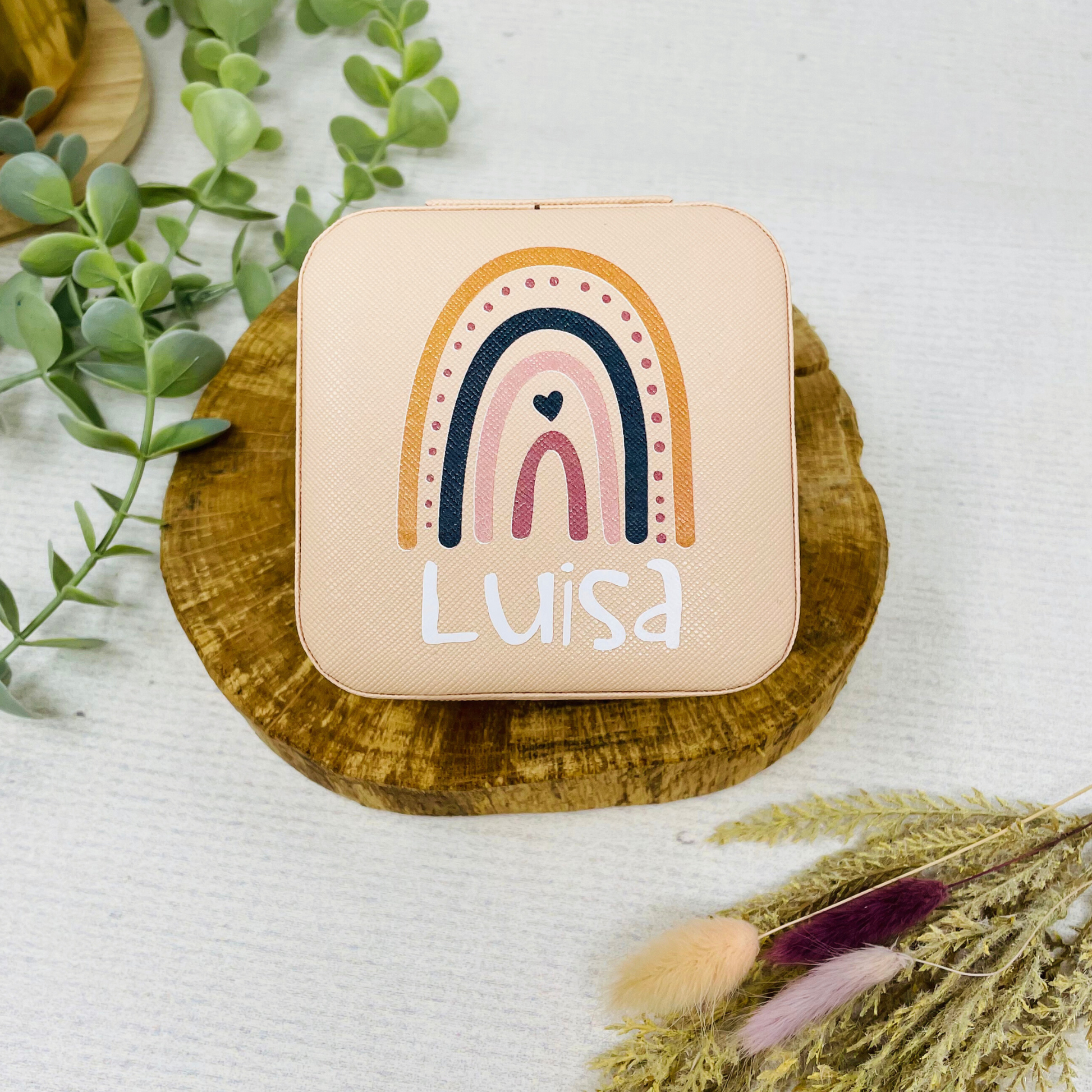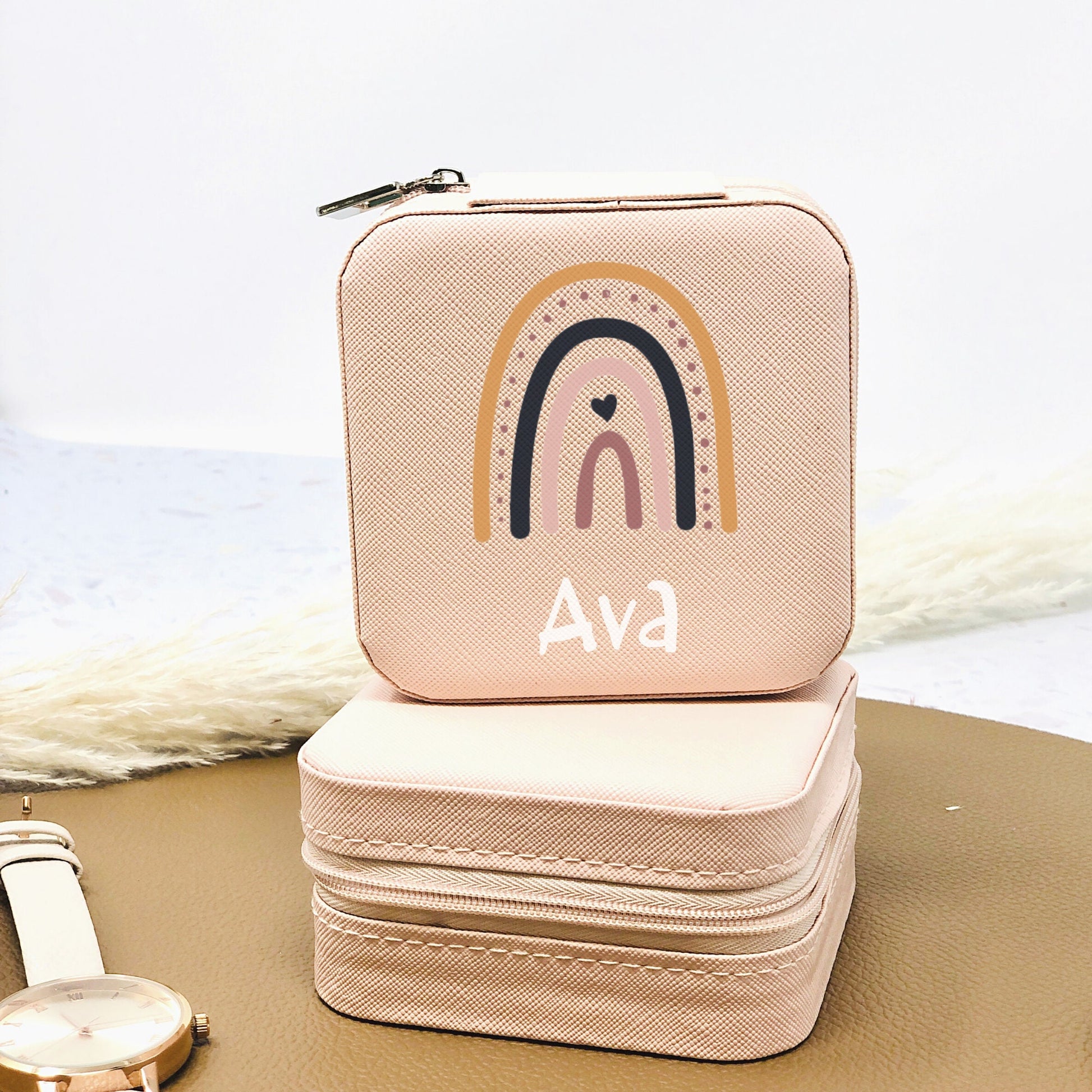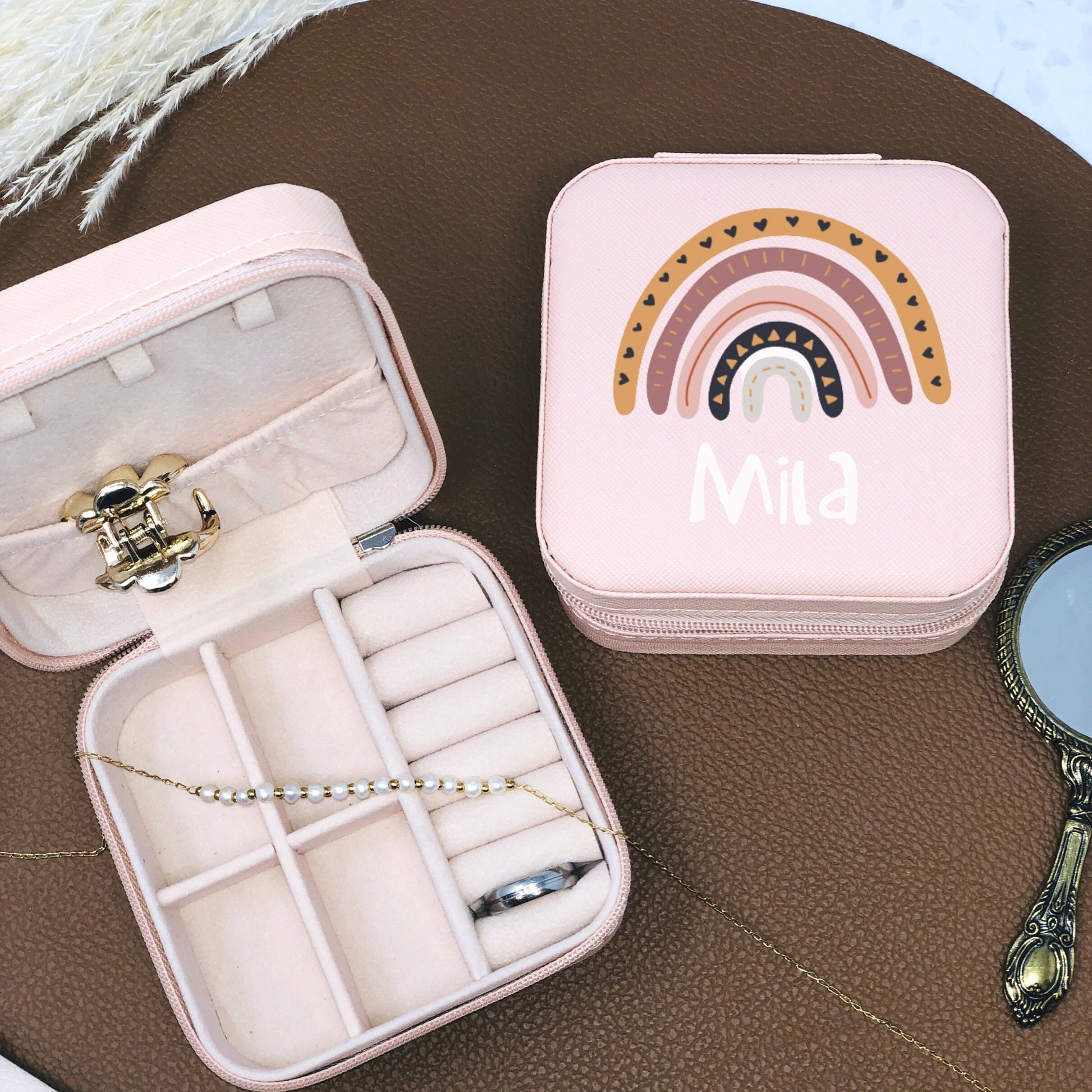 Schmuckaufbewahrung Mädchen - rosa - personalisiert mit Namen und Regenbogen- Geschenk Kommunion Einschulung Geburtstag - Reiseetui