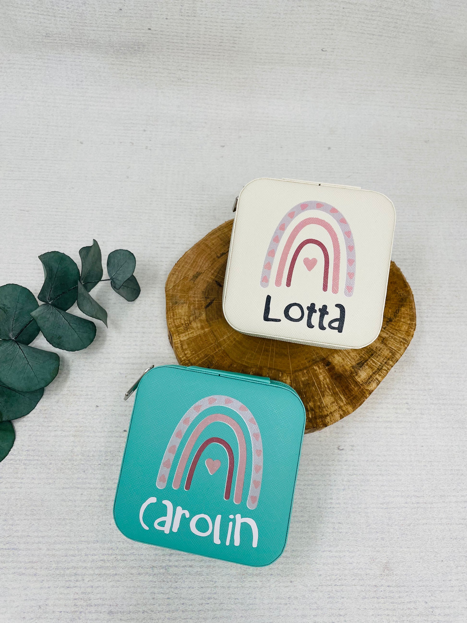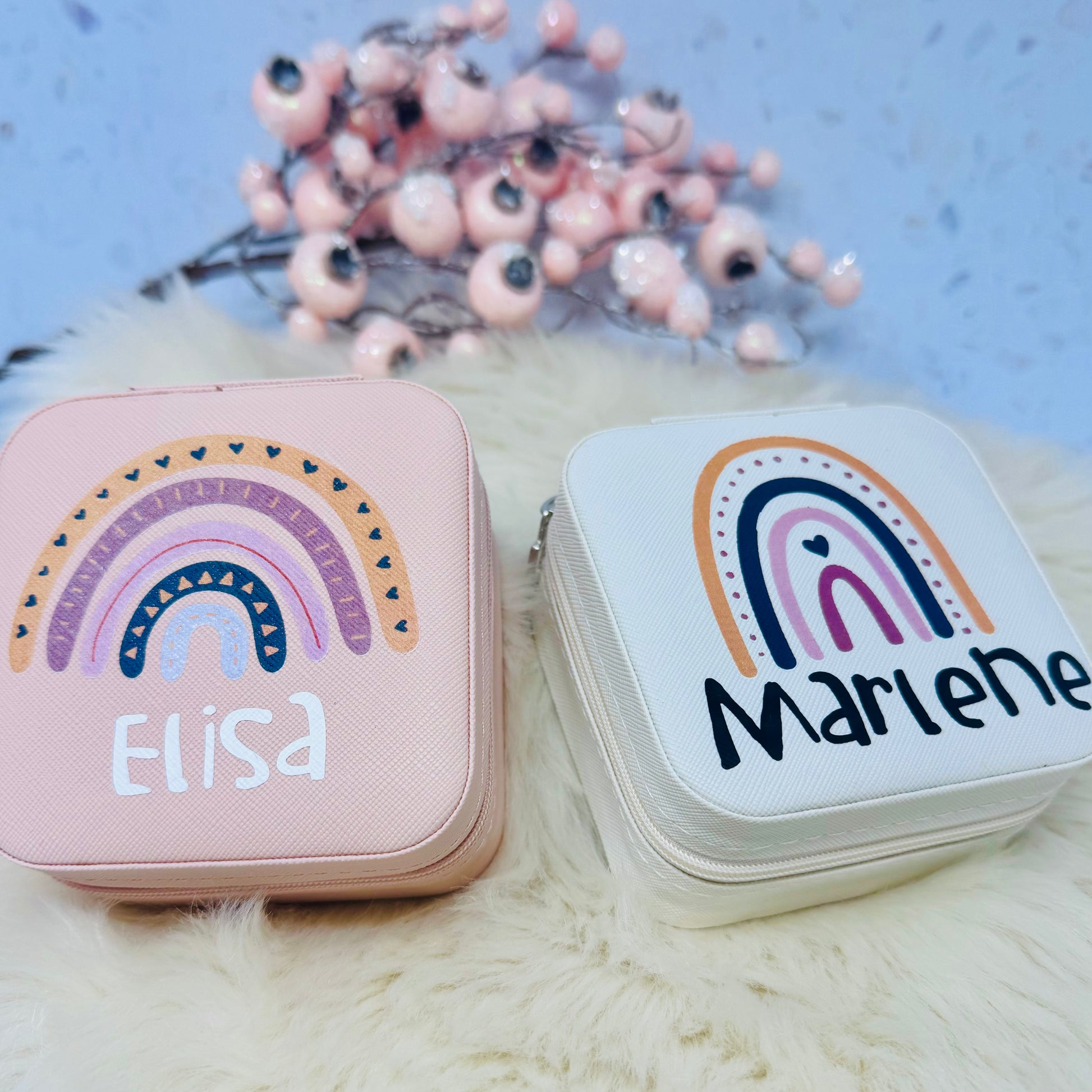 Schmuckschatulle Etui Mädchen - personalisiert mit Namen und Regenbogen- Geschenk Kommunion Einschulung Geburtstag - altweiß